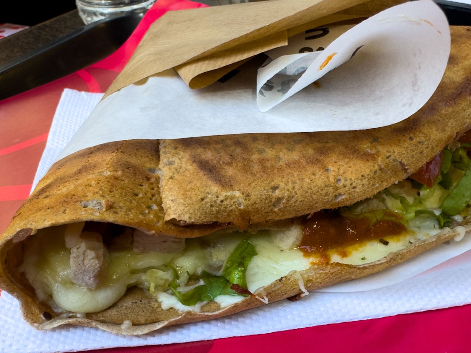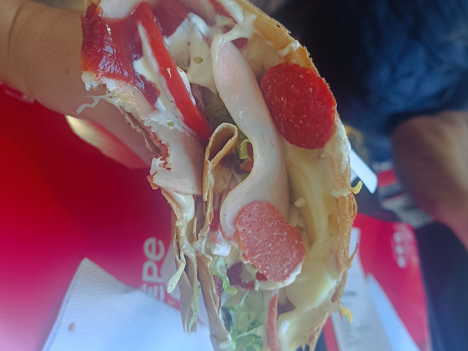 El local es algo pequeño, y sin aspiraciones de ningún tipo. Sitio de batalla (aunque eso es bueno), se come bien, es abundante, barato y está rico. El camarero que atiende a los clientes pendiente de todo, muy bien. Comimos una crep salada variada (jamón, champiñones, mucho queso, lechuga, tomate) y una dulce de fresa y banana. Estaba todo rico y caliente. Completamente recomendable.
